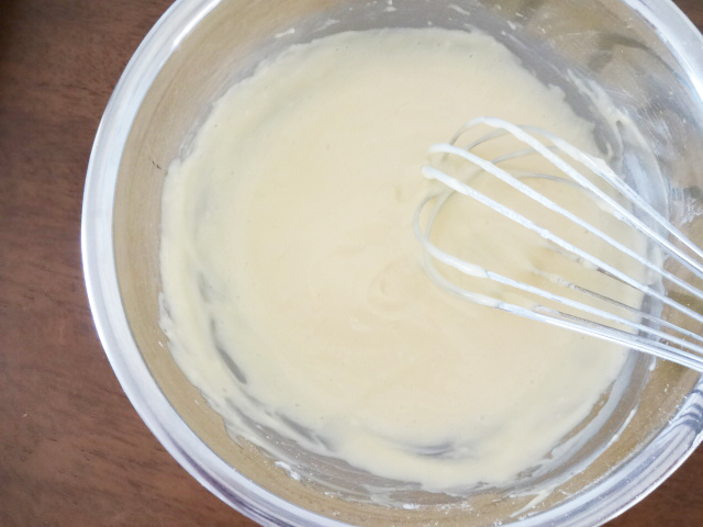 レモン汁、生クリーム、ふるった薄力粉を順に加え混ぜる。