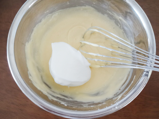 4にメレンゲを一すくい加え完全に見えなくなるまで混ぜ。
