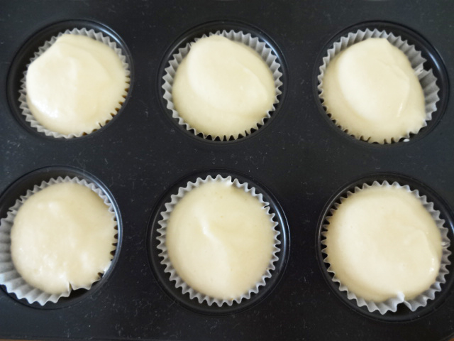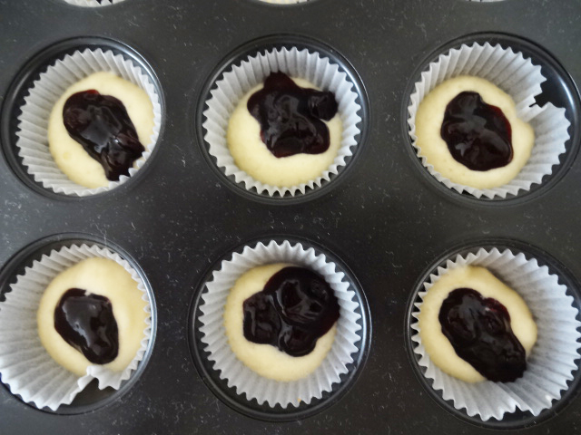 ミニマフィンカップの底に少量生地を入れその上にブルーベリージャムを入れさらに9分目まで生地を入れる。
