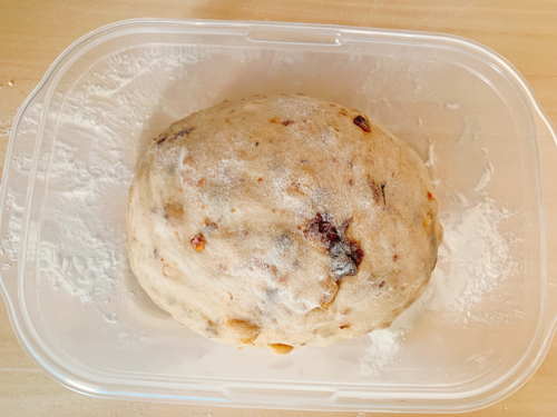粉をし、ガスを抜く。丸めなおし、密閉容器に入れ野菜室で1時間休ませる。