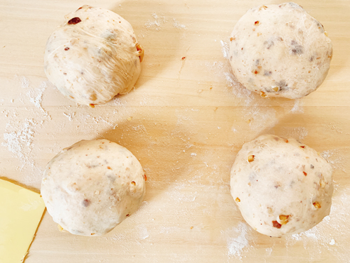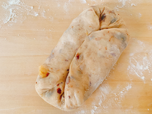 手粉をし、ガスを抜き、4等分して丸めて濡れ布巾を掛けベンチタイム15分。とじ目を上にして手で軽くつぶし、三つ折にして更に両端をつける。長細い楕円形にする。