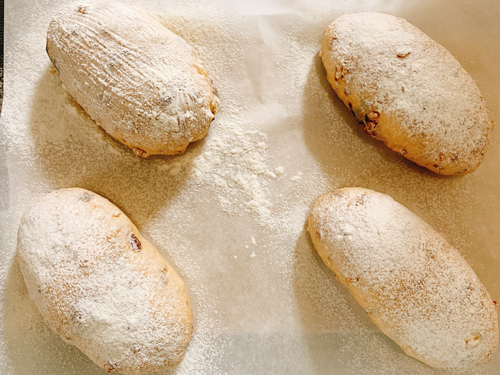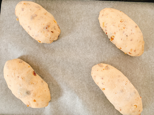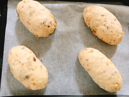 天板にオーブンペーパートを敷き、とじ目を下にして置き、濡れ布巾を掛け、全体をビニール袋で包み暖かいところで、1時間ほど二次発酵する。