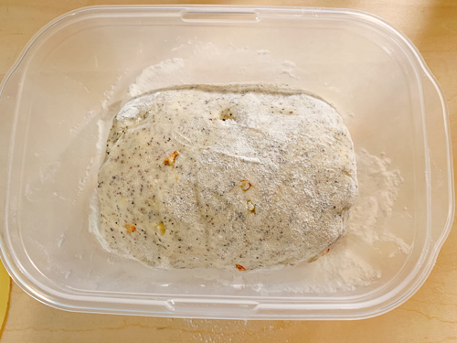 手粉をし、ガスを抜く。縦横三つ折にして密閉容器に入れ、冷蔵庫の野菜室で30分ほど休ませる。