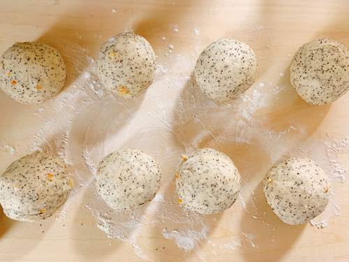粉を振り、台にあけ、8等分にして丸め、濡れ布巾を掛けベンチタイム15分。