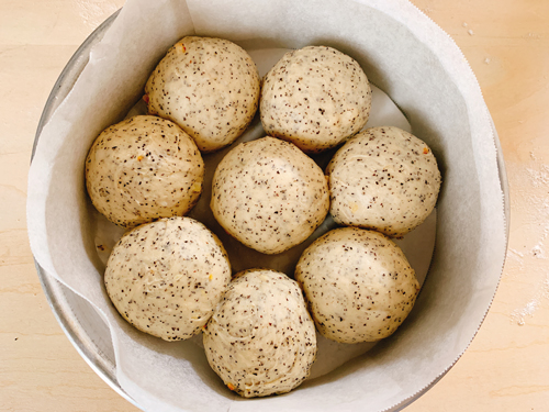 丸めなおし、型に写真のように並べ、全体をビニール袋に入れ、2次発酵1時間ほど。照り出し用の牛乳を刷毛で塗る。