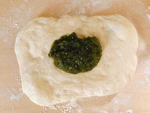 生地を指で平らにし、バジルペーストを適宜のせる。1/3真ん中でたたみ、反対側から生地を重ねる。