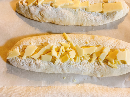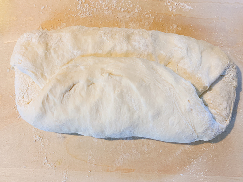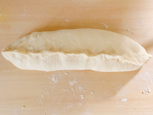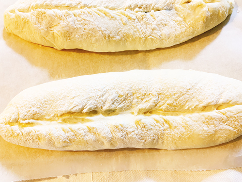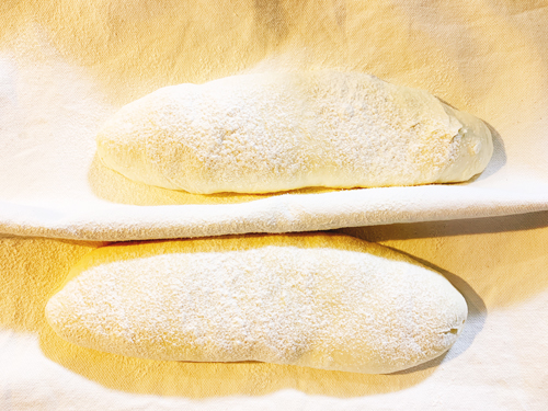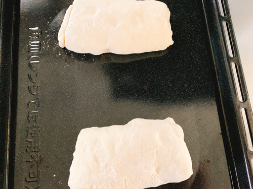 生地を2等分して、三つ折にして天板に並べる。ビニール袋で包み、ベンチタイム30分。