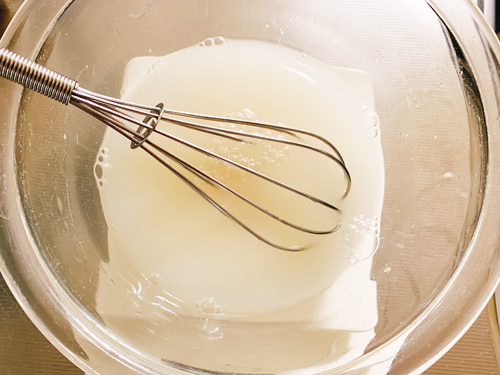 モルトパウダーを0.3g計る。電子秤にボウルをのせ、ホイッパーものせ、0にする。計ったモルトパウダーをボウルに入れる。