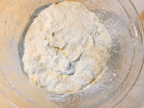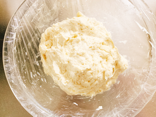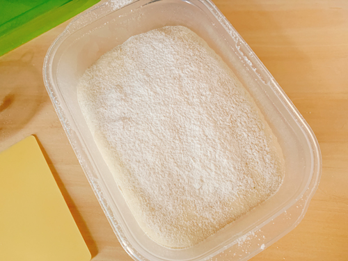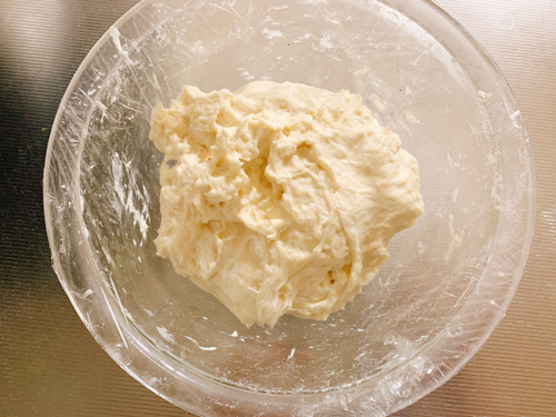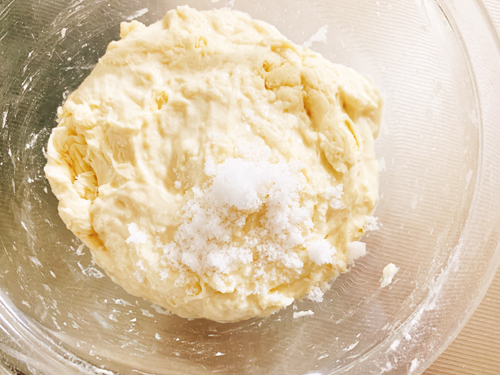 分量の塩を振り入れ、周りから畳むように混ぜる。70回ほど。ラップをして、30分休ませる。