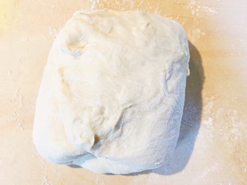 上から茶漉しで粉を振りスケッパーで周りをはがし、ボウルを逆さにして、台に生地を出す。