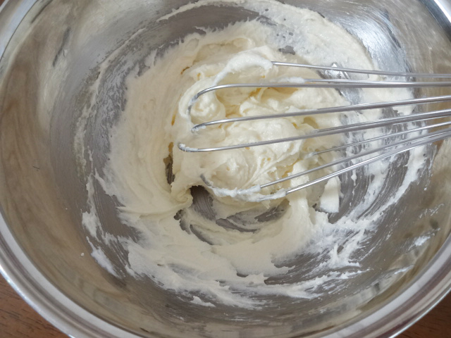 ラードをボウルに入れ泡だて器で空気を入れるようによく擦り混ぜる。