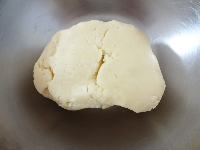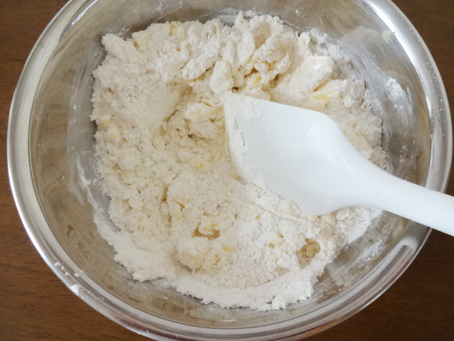 ふるった粉類を一度に加え、ゴムベラでさっくりと混ぜまとまってきたら、手でひとまとめにする。