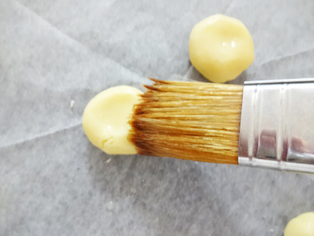 刷毛で表面に卵白を塗り、空焼きしたアーモンドをのせる。