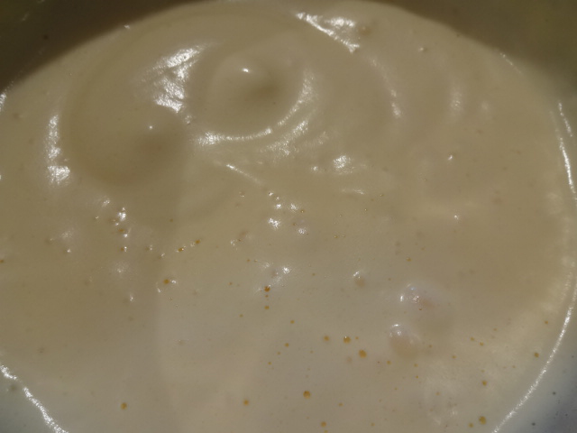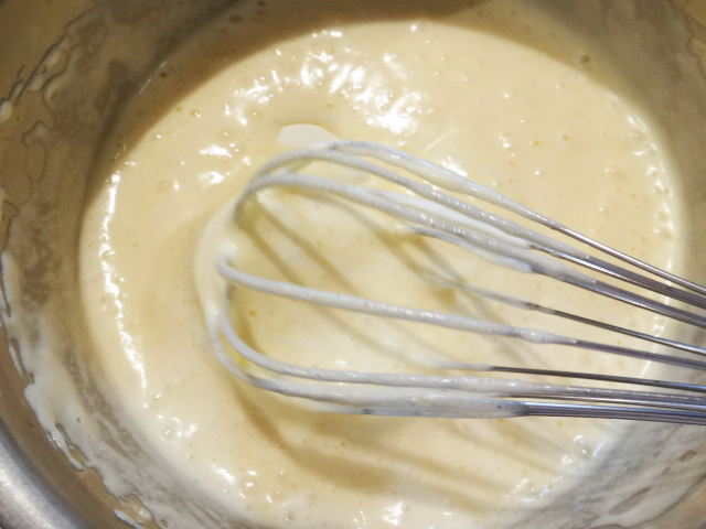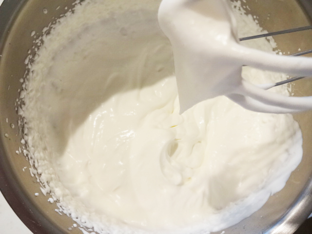 ハンドミキサーで白くもったりとするまで泡立てる。