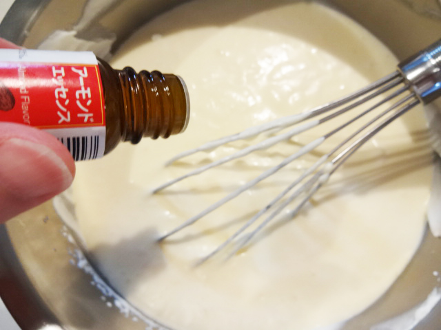 残りのクリームを加え泡だて器で下からすくい上げるように混ぜ合わせる。アーモンドエッセンスを3滴加える。