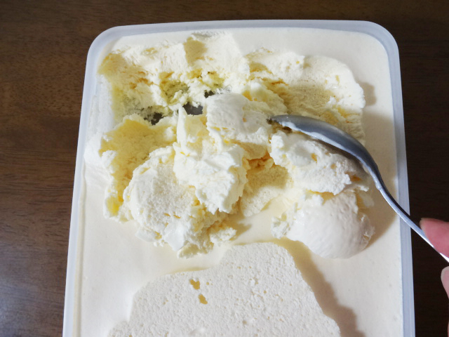 冷凍庫から取り出しスプーンで空気を入れるように全体を混ぜる。再び冷凍庫でしっかりと冷やし固める。