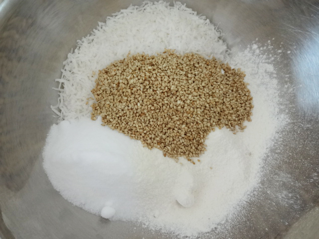 ボウルに刻んだココナッツ・ゴマ・グラニュー糖・ふるった薄力粉を入れ、ゴムベラでざっと混ぜる。