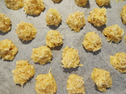 生地をスプーンですくい、オーブンペーパーを敷いた天板に一口大ずつ置く。