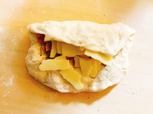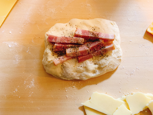 生地を指で平らにし、にんにくを擦り付け、ベーコン、ブラックペッパー、スライスチーズ1枚分をちぎってのせる。