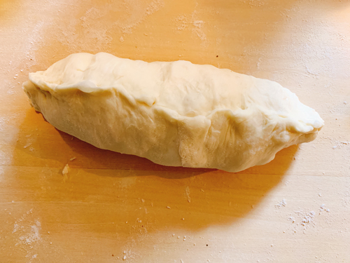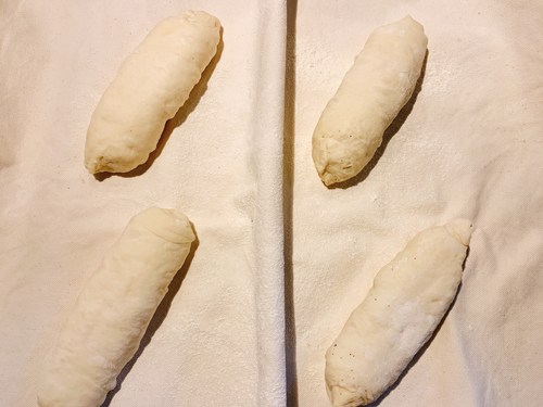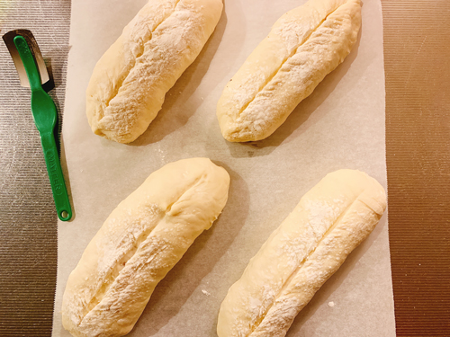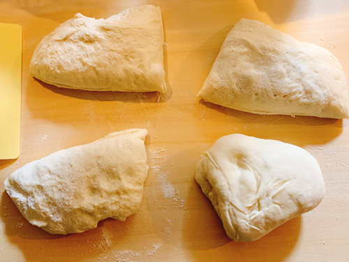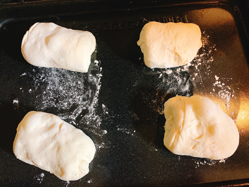 生地を4等分して、三つ折にして天板に並べる。ビニール袋で包み、ベンチタイム30分。