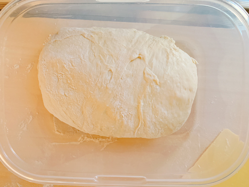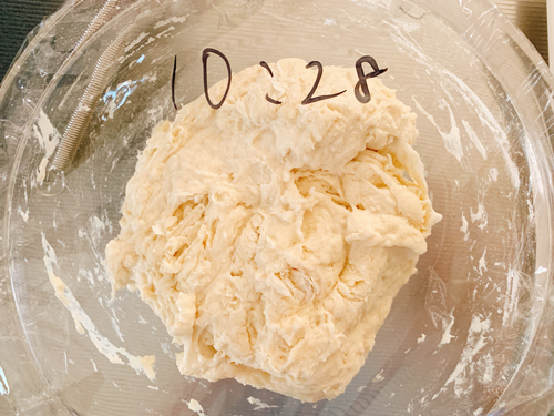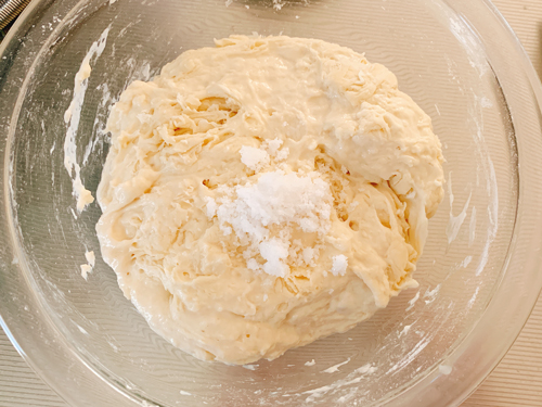 分量の塩を振り入れ、周りから畳むように混ぜる。70回ほど。ラップをして、30分休ませる。
