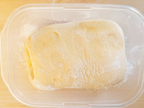 終わったら、粉を振り、パン生地を取り出し、ガスを抜いたら三つ折りにして、密閉容器に入れ冷蔵庫で30分休ませる。