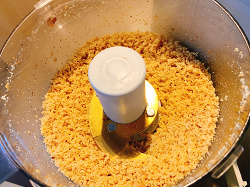 (くるみバターを作る)炒った生クルミをフードプロセッサーなどで細かく砕く。