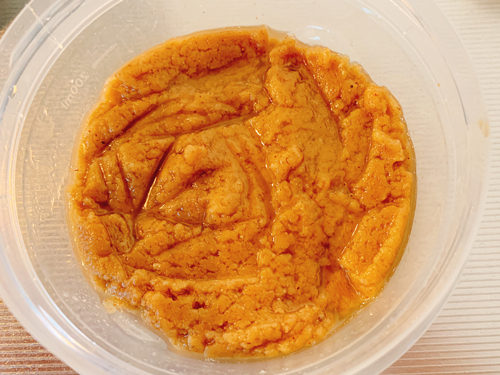 くるみバターは冷蔵庫に入れると固くなるので使うときは室温に戻してください。