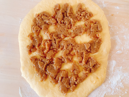 パン生地を台に戻し、20cmほどに伸ばしてくるみバターを広げる。