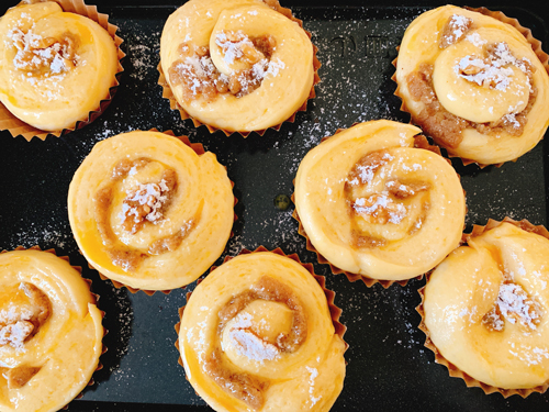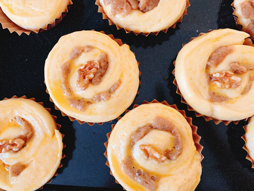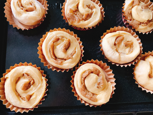 8等分に切り、天板に並べたマドレーヌカップに乗せていく。 全体をビニール袋で覆い暖かい所で二次発酵30分。