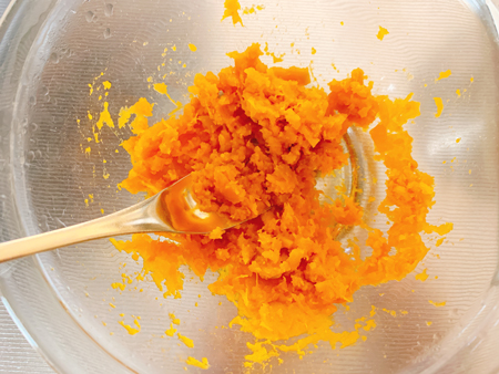 皮をむいたかぼちゃを耐熱容器に入れてラップをして700wで3分ほどやわらかくなるまで加熱する。かぼちゃをフォークなどで潰す。