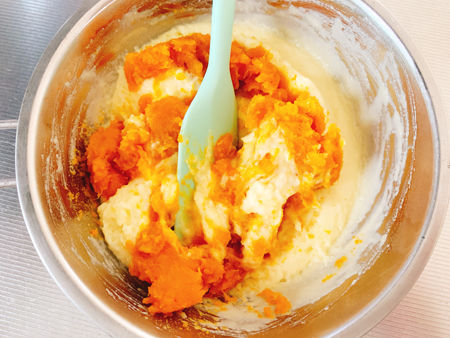 冷ましたかぼちゃとクリームを合わせて冷蔵庫に入れておく。