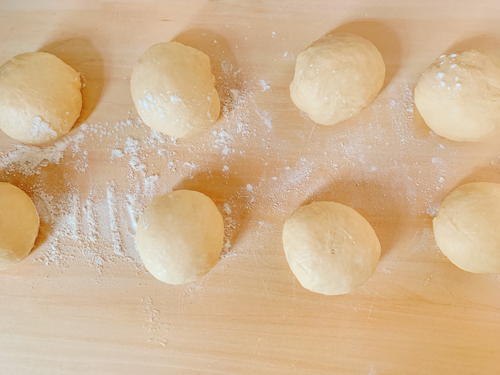 ガスを抜き8分割にして濡れ布巾を掛けベンチタイム15分。