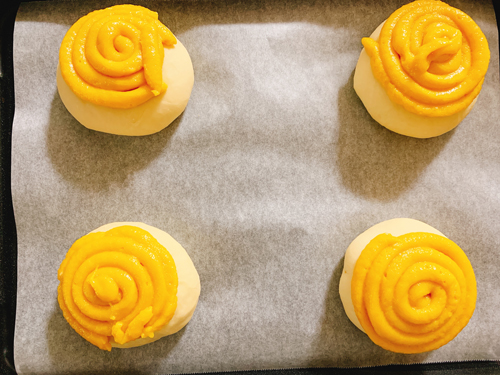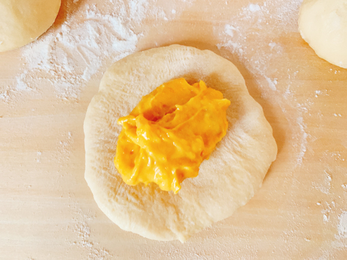 ガスを抜き、生地を平らにしてクリームを35gほどのせる。クリームを包み込み、 とじ目をしっかりととじる。