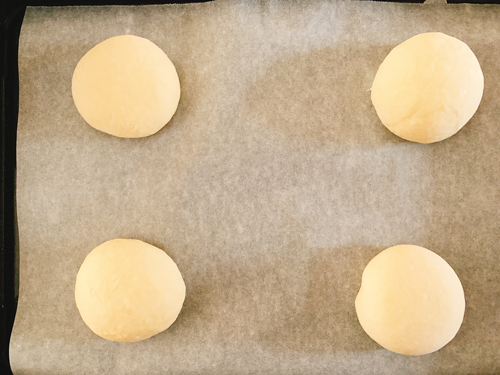 天板オーブンペーパーを敷き間隔をあけて並べる。乾燥しないように、濡れ布巾を掛け、ビニール袋で包み、暖かいところで2次発酵30分。