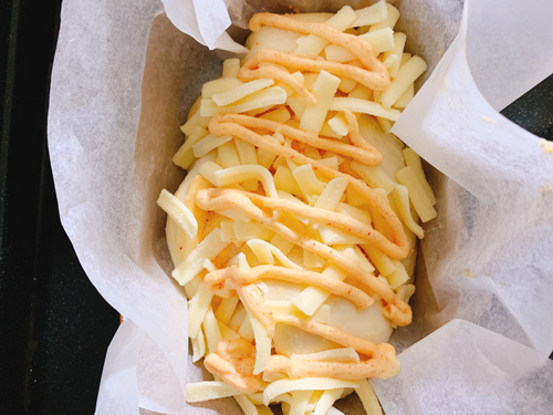 オーブンを230度に予熱しておく。ピザ用チーズを適宜のせ、残りの明太マヨをかける。