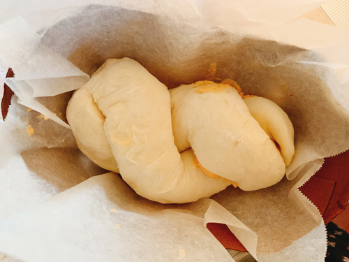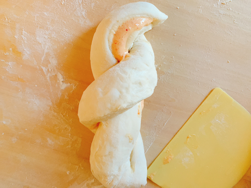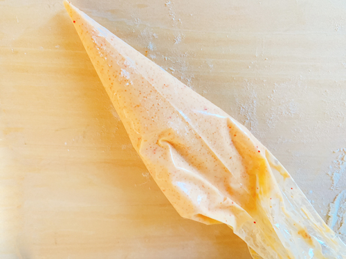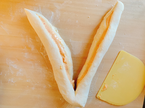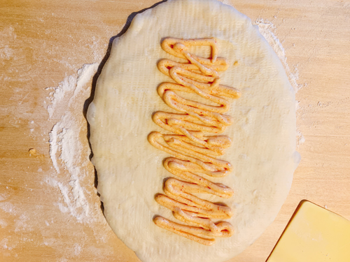 ガスを抜き、楕円に伸ばして明太マヨを1/4量搾り出す。もう一つの生地も同じく。