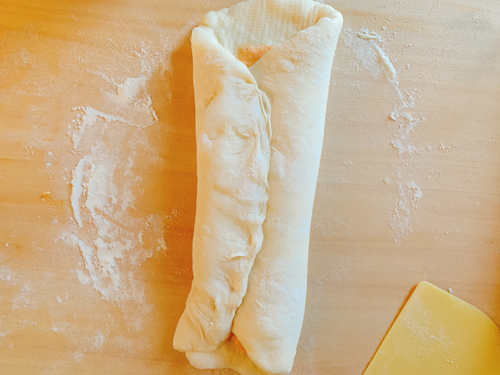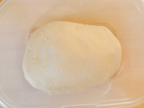 手粉をし、ガスを抜く。縦横三つ折にして密閉容器に入れ、冷蔵庫の野菜室で30分ほど休ませる。