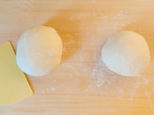 粉を振り、台にあけ、2等分にして丸め、濡れ布巾を掛けベンチタイム15分。