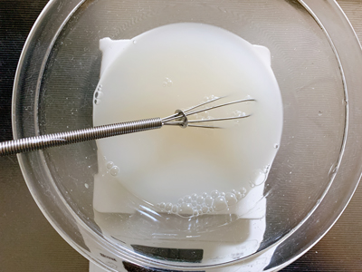 モルトパウダーを0.3g計る。電子秤にボウルをのせ、ホイッパーものせ、0にする。計ったモルトパウダーをボウルに入れる。