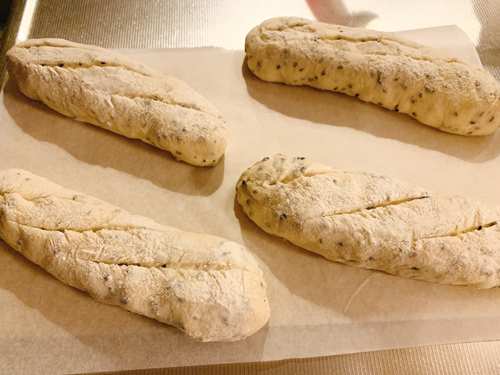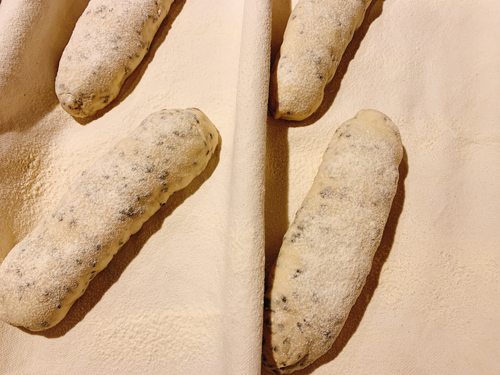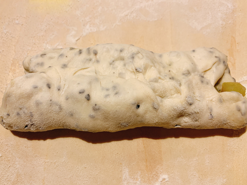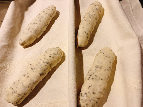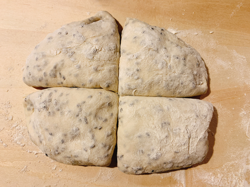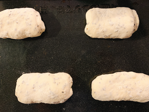 生地を4等分して、三つ折にして天板に並べる。ビニール袋で包み、ベンチタイム30分。