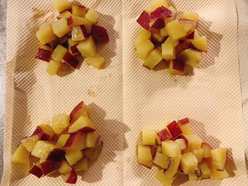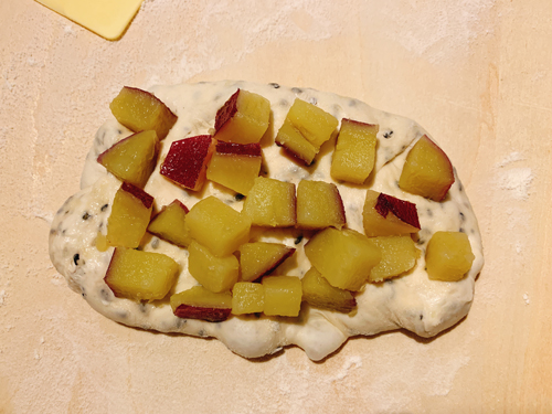 生地を指で平らにし、さつまいもをのせる。1/3真ん中でたたみ、反対側から生地を重ねる。更に半分に折り端をつまんでとじ目をしっかりとじる。