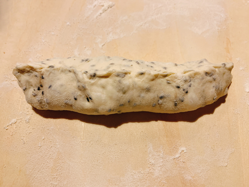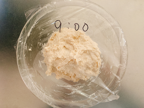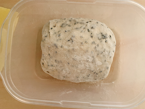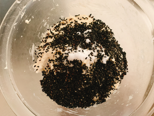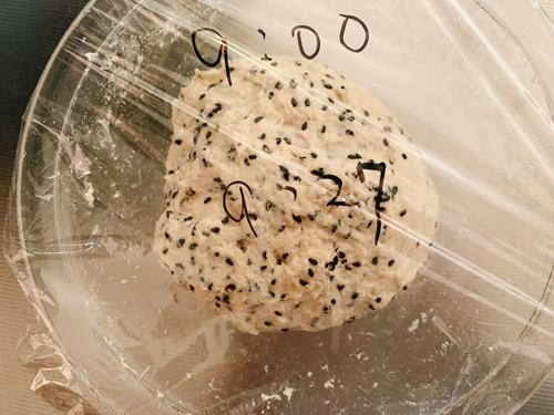 分量の塩と黒ゴマを振り入れ、周りから畳むように混ぜる。70回ほど。ラップをして、30分休ませる。