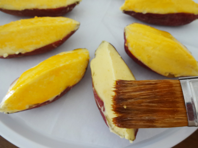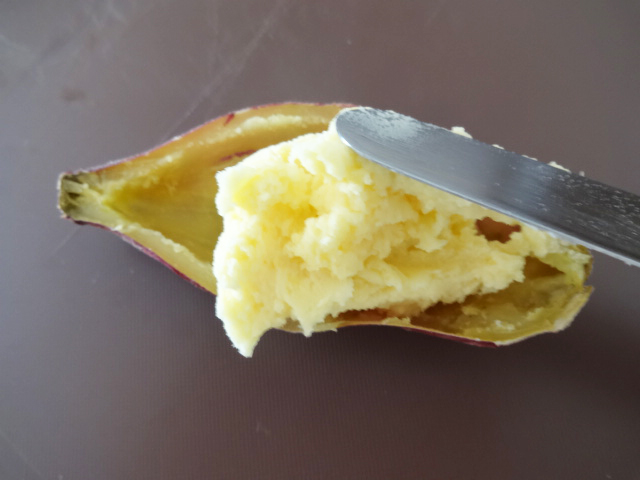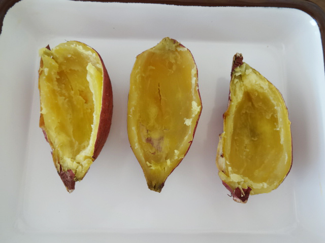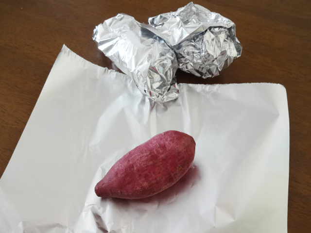さつまいもをよく洗いアルミホイルで包み180℃のオーブンへ入れ1時間焼く。竹串で刺してすっと通ればオーブンから出す。