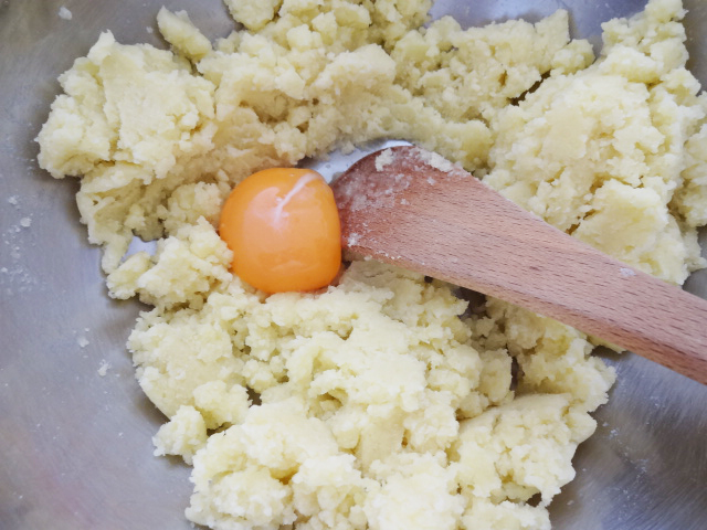 ボウルにペーストに入れグラニュー糖を加え木べらで混ぜる。卵黄も加える。