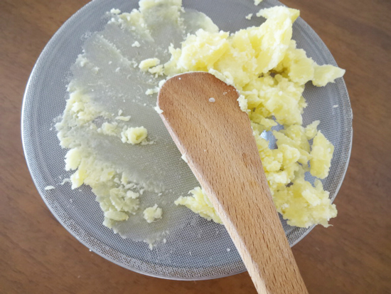 3を鍋に戻し、火にかけ混ぜながら炊く。クリーム状になったら火を止めバニラエッセンスと無塩バターを加えて混ぜ、別のボウルに移しすぐにボウルの底を冷やす。