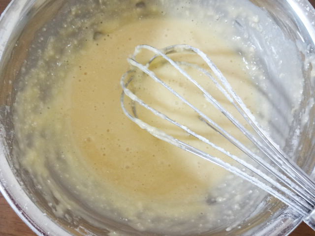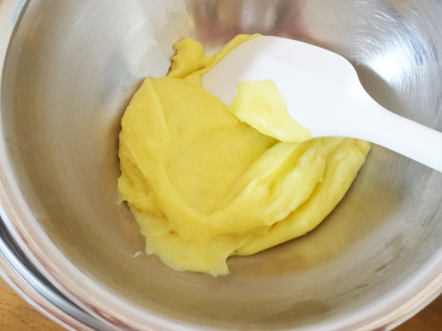 ボウルに卵黄とグラニュー糖を入れ白っぽくなるまでよく混ぜる。さつまいもペーストを加え、続けて薄力粉を粉気が見えなくなるまで混ぜ、牛乳を加える。