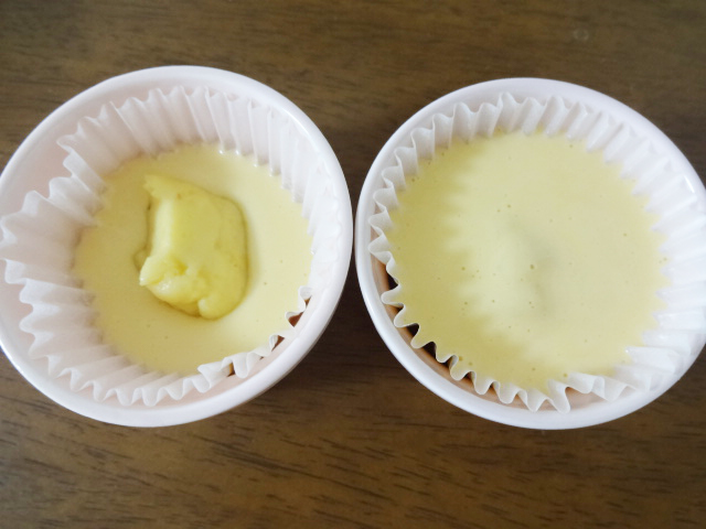 ココットに紙製ベーキングカップをセットし生地を少量入れる。冷やしておいたクリームを入れかぶせるように再び生地を入れる。
