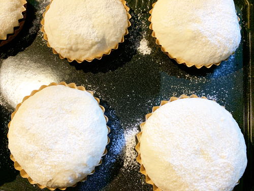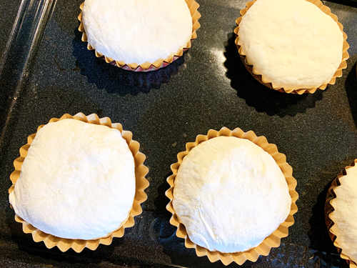 天板に並べ、全体をビニールで包んで2次発酵60分。オーブンは260度に温めておく。