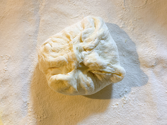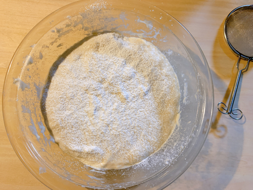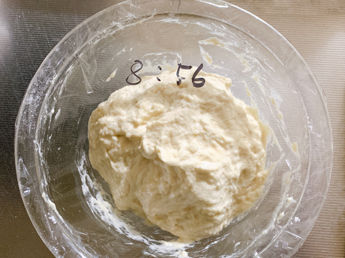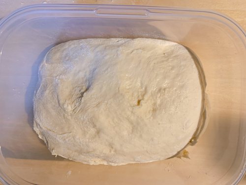 粉を振り、台に生地をあけ、ガスを抜き、密閉容器に入れ、野菜室で6時間ゆっくりと1次発酵。
